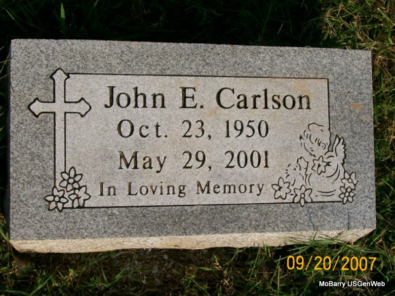 Inscription: "In Loving Memory" - Research Note: His obit has his name as John Edwin McGinnis, and not Carlson as the stone reads. The log book for this cemetery has his name as John Edwin Carlson. Katie Carlson, his mother, purchased the cemetery lot and he is buried next to her. - Preceded in death by his father, William Edward McGinnis. Donna's Note: John Edwin McGinnis, age 50, of Monett, died May 29, 2001, at Cox Monett Hospital following a sudden illness. He was born October 23, 1950, in Sandwich, Illinois. He was a disabled general laborer and attended Ebenezer Baptist Church in Monett. Son of William Edward McGinnis and Katie Mable (Yancy) (McGinnis) Carlson. He was preceded in death by his father, William Edward McGinnis. He is not listed in the cemetery log book. - | Monett Times May 29, 2001 Mary Homesley Monett Times May 29, 2001 IOOF Log Book Donna Cooper |