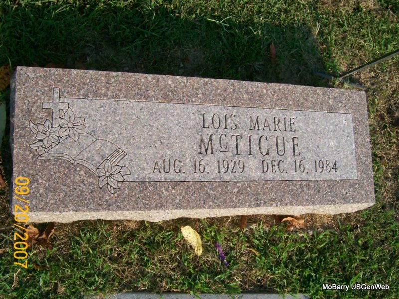 | MCTIGUE, Lois Marie | Aug. 16, 1929 | Dec. 16, 1984 | Research Note: The City of Monett has recorded that she was buried Dec. 19, 1984 in a lot owned by Lois M. McTigue, in the 3rd section, in bock 10, in a single lot in grave 8, in single #8, on Dec. 18, 1984. | IOOF Log Book Donna Cooper Photo Jay Trace |