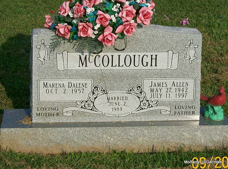 SSW: Marena Dalene - Inscription: "Married June 2, 1983" - Research Note: He is buried in the 3rd Section, Block 22, Lot 1, Grave 1. Donna's Note: This person is listed in the log book spelled incorrectly as McCullough - stone reads McCollough. - Possible son of Everett McCollough and Helen Mae Mason married on Oct. 10, 1937 in AR. | IOOF Log Book AR Marriage Index Phyllis Long Note Donna Cooper Photo Jay Trace |