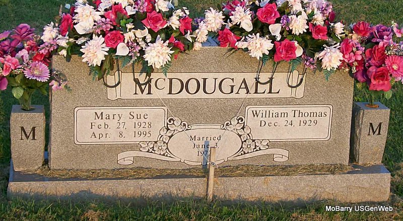 SSW: Clyde Thomas - Inscription: "Married Dec. 28, 1952" - Research Note: Daughter of Felix Mourglia and Helen Ina Blankenship, both buried at IOOF cemetery. Marilyn graduated from Monett High School in 1949. She went to Drury College in Springfield, Missouri as a history major. She left school to marry Clyde Thomas McKee "Sonny" on Dec. 28, 1952 at the Baptist Church in Monett. Sonny and Marilyn lived just eight blocks apart during their childhood and teen years until going to college. They began dating when Marilyn was 16 years old. After their marriage, they moved to North Kansas City, Missouri, where Sonny took a job as a quality assurance manager at the Ford plant, which was then an airplane factory, and Marilyn worked at a bank. Marilyn became a housewife after their first child was born. Sonny became the youngest State Farm agent in the Kansas City area at the age of 23. She was preceded in death by her parents, and her husband, Sonny. - Back of Stone | Census Bennett-Wormington Funeral Home Phyllis Long Photos Jay Trace |
