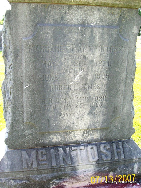 | MCINTOSH, Margaret May (YEAKEL) | May 31, 1871 | June 19, 1905 | SSW: Robert James - Research Note: First wife of Robert James McIntosh. Daughter of James Yeakel and Letha Ann Moore. | Census Phyllis Long Photo Jay Trace |