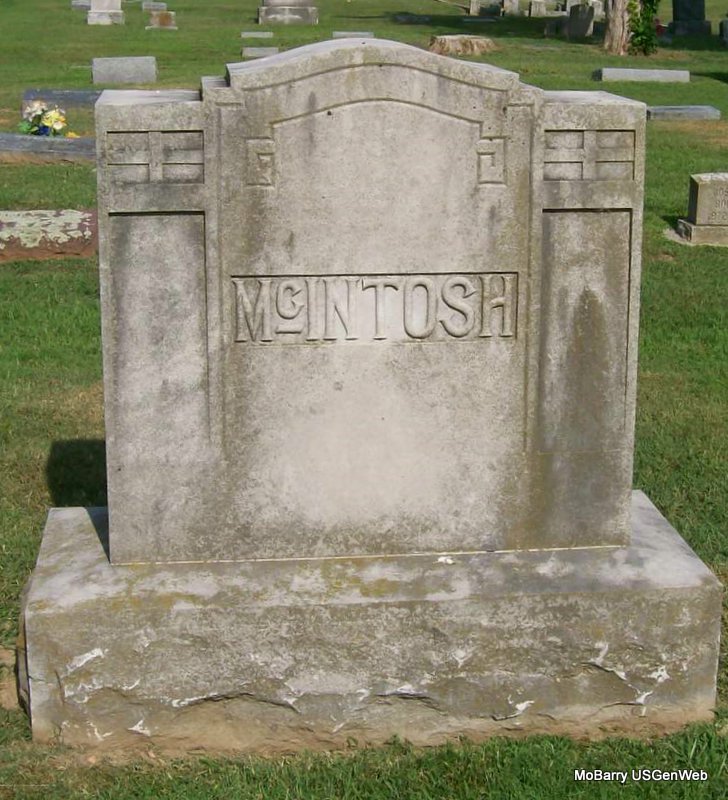 SSW: Anna I. - Research Note: Son of George W. McIntosh and Alice Louise Wallen. Homer was a photographer according to online newspapers. Death certificate says he was a retired stockman and owner of a hardware store. Resident of Monett, Barry Co., MO. His wife, Anna was the informant. - His first wife was May Mildred Peters and second wife Anna. - McIntosh Plot Stone - Another Photo | Census Death Certificate Phyllis Long Photo Donna Cooper |