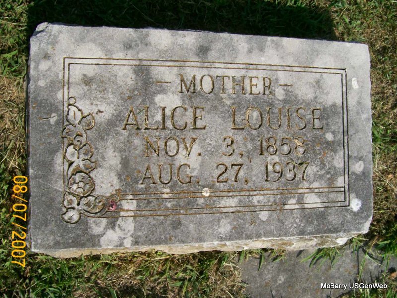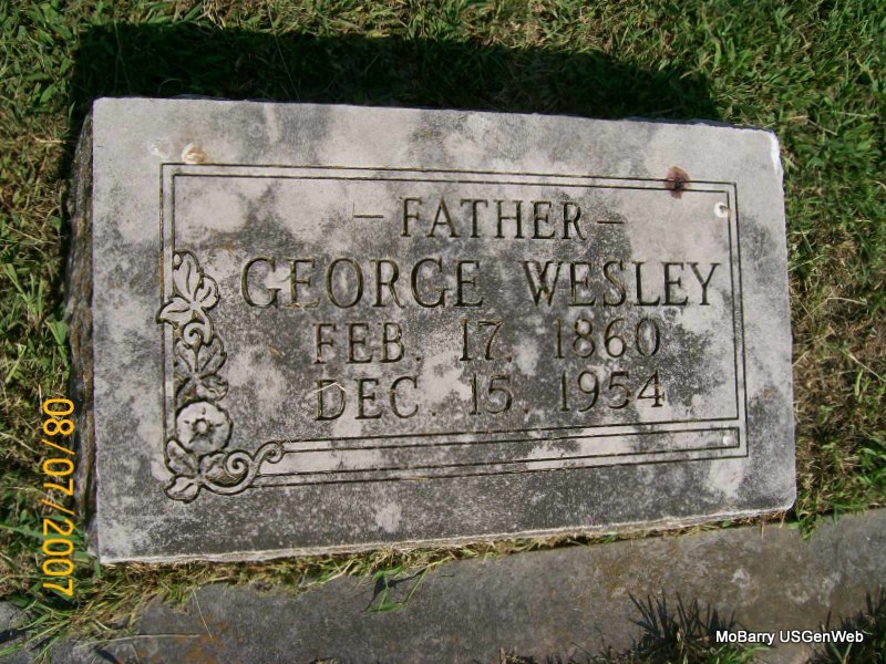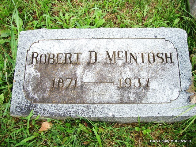 Research Note: His death certificate reads that James McIntosh was his father and Elizabeth Bradwell was his mother. Otis McIntosh, Monett, MO, gave the information. His wife was Alice Louise Wallen. - Cassville Democrat, Dec. 22, 1954 - George Wesley McIntosh, 94, pioneer county resident and one of the county's first dairymen, died Wednesday afternoon at his home near Monett after a sickness of five months. He had been an invalid because of losing his eyesight following a case of influenza in 1910. Mr. McIntosh was born on February 12, 1860, in Pittsburgh, Pa., and came to Barry County with his parents to settle in the Gunter community at the age of 12 years. He lived here for a number of years and still owned the place at the time of his death. He was united in marriage to Miss Alice Louise Wallen in 1882 at the Waldensian Presbyterian Church to be one of the first to be performed in the church. She preceded him in death in 1937. He was an old member of the Kings Prairie Union Church, which is no longer in existence. Surviving are two sons, Otis McIntosh of the home and Homer McIntosh of the home: a daughter, Mrs. Maude Carlin, of Monett, and a sister, Mrs. Elizabeth McComas of Shell Brook, Saskatchewan, Canada and a grandchild and great-grandchild. Mr. McIntosh brought the first herd of registered Holsteins to the county in the 1890's to engage in the dairy business in a systematic way. He had a contract with the Fred Harvey System, operating eating houses on the Frisco, to supply them with milk and was there when the first Frisco train pulled into town. Funeral services were conducted at the Mercer Funeral Chapel in Monett, with Rev. L. N. Bartlesmyer officiating. Burial was in the IOOF Cemetery. - Cassville Republican, Barry Co., MO, Thursday, Jan. 11, 1894 - Geo. W. McIntosh of Monett was before the Probate court Monday. Mr. McIntosh is Monett's leading dairyman. - McIntosh Plot Stone - Plot Stone - Another Photo | Death Certificate Photo Donna Cooper Online Obit Online Newspapers Phyllis Long Photo Jay Trace |