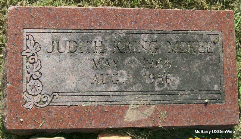 | MCKEE, Judith (KRING) | May 1905 | Aug. 1956 | Research Note: The cemetery log reads that she was buried Aug. 22, 1956 in the old section, in block 35 in lot 1,in grave 7 in the NE 1/4. H. B. Westenhaver purchased the lot. She is buried next to Ida Westenhaver. - Maybe wife of Clyde Sherman McKee born 1899. Ida Westenhaver was the first wife of Hubert B. Westenhaver. Hubert second married Norah Mae (Link) (Kring) Westenhaver. - 1940 Census, Kansas City, Jackson, Missouri - Nora Westenhaver, age 63, with granddaughter Joanne McKee, age 12. Maybe a daughter of Judith? Must be a connection. I don't find Judith in the census. See Westenhaver buried here in IOOF. | IOOF Log Book Donna Cooper Note Census Phyllis Long Photo Jay Trace |