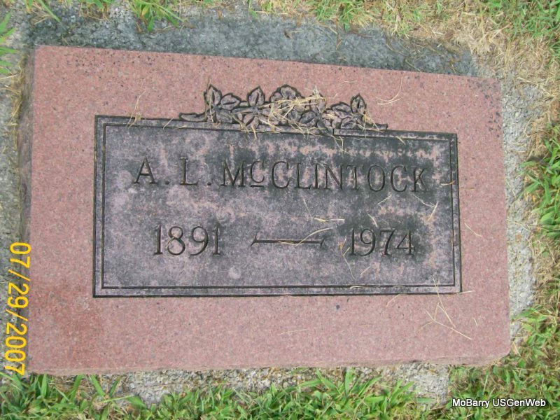 Research Note: The cemetery log book reads that his name was Albert L. McClintock. Son of Evans Boyd McClintock and Martha Tilitha Poyner. His wife was Mattie Rosalie Wheeler. | IOOF Log Book Census Phyllis Long Photo Jay Trace |