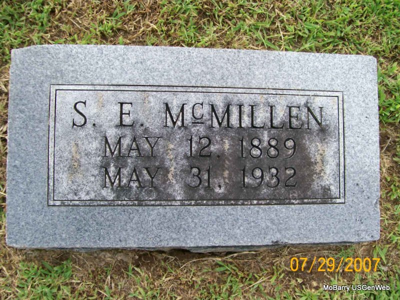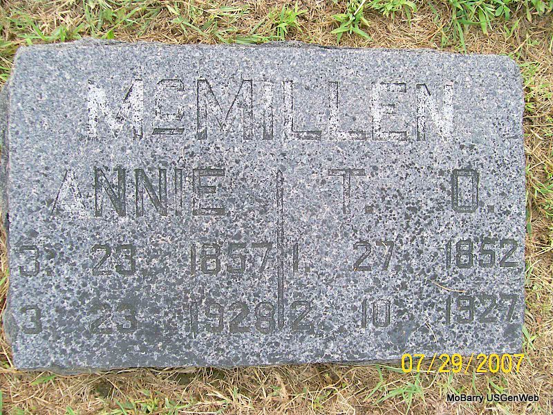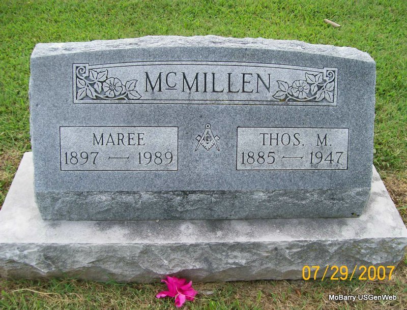 SSW: Annie - Research Note: His death certificate reads that Thomas M. McMillen was his father.(Thomas M. was probably his son. Census confirms that he was the son of James Marion McMillen.) Mary Ann (Thompson) was given as his wife's name. Ed McMillen (son) of Monett, MO, was the informant. | Death Certificate Donna Cooper Census Phyllis Long Photo Jay Trace |
