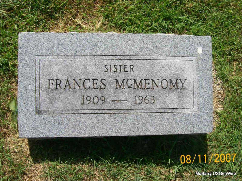 Inscription: "Sister" - Research Note: She is buried next to Clara Robinson. Clara was her mother and remarried to Joe Robinson. The cemetery log book has that this person was buried Aug. 28, 1963 and that Clara Davenport purchased the lot. She is buried in the old section, in block 58, in lot 1,in grave 7, in SE 1/4. The cemetery log has her with the name of McMenomy. - Usual residence was St. Louis, MO. She was a nurse. Daughter of Frank Davenport and Clara (Pratt) (Davenport) Robinson, both buried at IOOF cemetery. Wife of Elmer McMenomy. Robert McMenomy was the informant on the death certificate. - Frankie E. Davenport married E. C. (Elmer Clarence) McMenomy on Oct. 31, 1928, in Aurora, Lawrence Co., MO. Her mother, Mrs. J. M. Robinson, gave consent. Divorced. Elmer remarried at age 40 to Pauline L. O'Dell, age 29, on Oct. 16, 1947 in Jackson Co., MO and died in St. Louis, MO. | IOOF Log Book Donna Cooper Death Certificate MO Marriage Records Census Phyllis Long Photo Jay Trace |