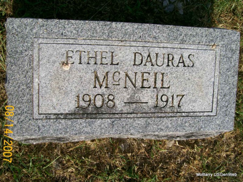 Research Note: Her death certificate has her name as Ethel Dorris McNeal. Her father's name not known, her mother Ethel McNeal, born in MO. Mrs. A. Guinney was the informant and she is buried next to Rebecca and Daniel Guinney. The cause of death was given as peritonitis and contributory of appendicitis. She was a student 9 years old. - She was the daughter of Charles A. McNeil and Ethel (Guinney) McNeil. Ethel was the daughter of Daniel and Rebecca. - Guinney Plot Stone | Death Certificate Donna Cooper Census Phyllis Long Photo Jay Trace |
