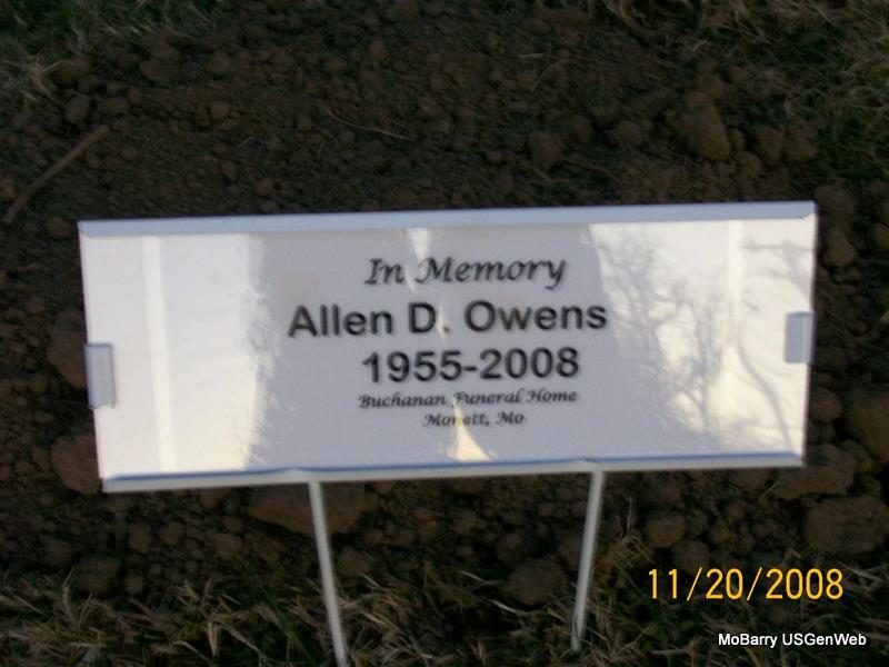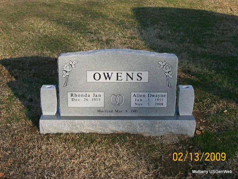 Inscription: "Married Mar. 6, 1981" - Research Note: He was the son of Lloyd Wayne and Naomi Imogene (Lawson) Owens. He was an Air Force veteran. Donna's Note: Allen D. Owens, 53, of Reeds, died Nov. 5, 2008, at St. John's Regional Medical Center in Joplin. He was born Jan. 1, 1955, in Monett, and a son of Lloyd Wayne and Naomi Imogene (Lawson) Owens. He was a retired truck driver of Tyson Foods, an Air Force veteran, and a member of the Christian Church in Aurora. He married Rhonda Zacharias Owens on March 6, 1981, in Olathe, Kansas of Buchanan Funeral Home of Monett. - Another Photo | Monett Times Photos Jay Trace |