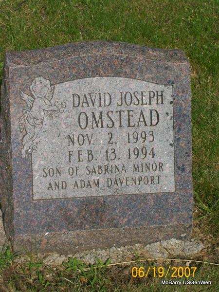 | OMSTEAD, David Joseph | Nov. 2, 1993 | Feb. 13, 1994 | Inscription: "SON OF SABRINA MINOR AND ADAM DAVENPORT" | Photo Jay Trace |