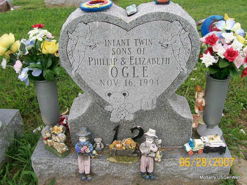 | OGLE, Infant Sons | No Date | Nov. 16, 1994 | Inscription: "Infant Twin Sons of Phillip and Elizabeth" - Research Note: Sons of Phillip Ogle and Elizabeth Etter. J. R. Etter purchased the cemetery lot according to the cemetery log book. - Back of Stone | IOOF Log Book Phyllis Long Photo Jay Trace |