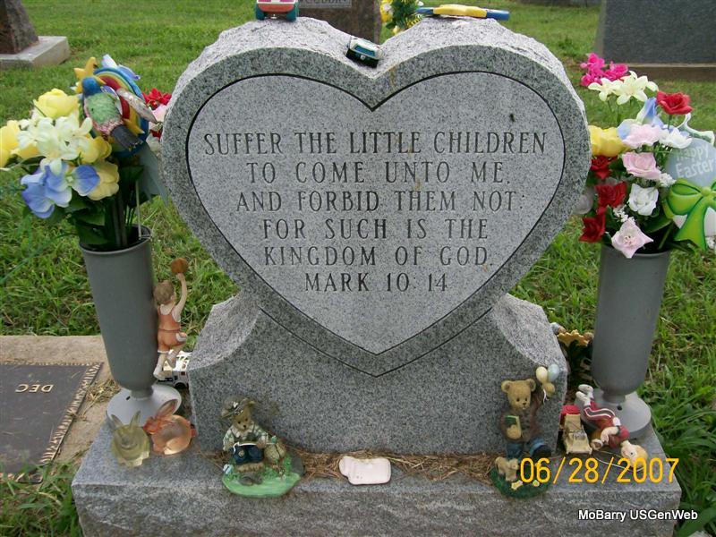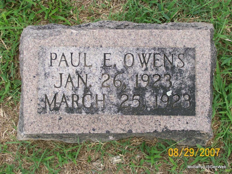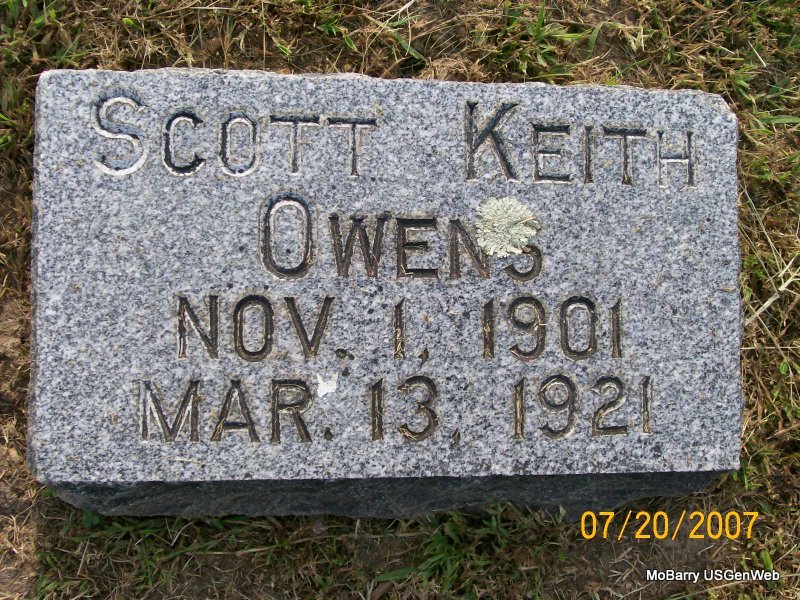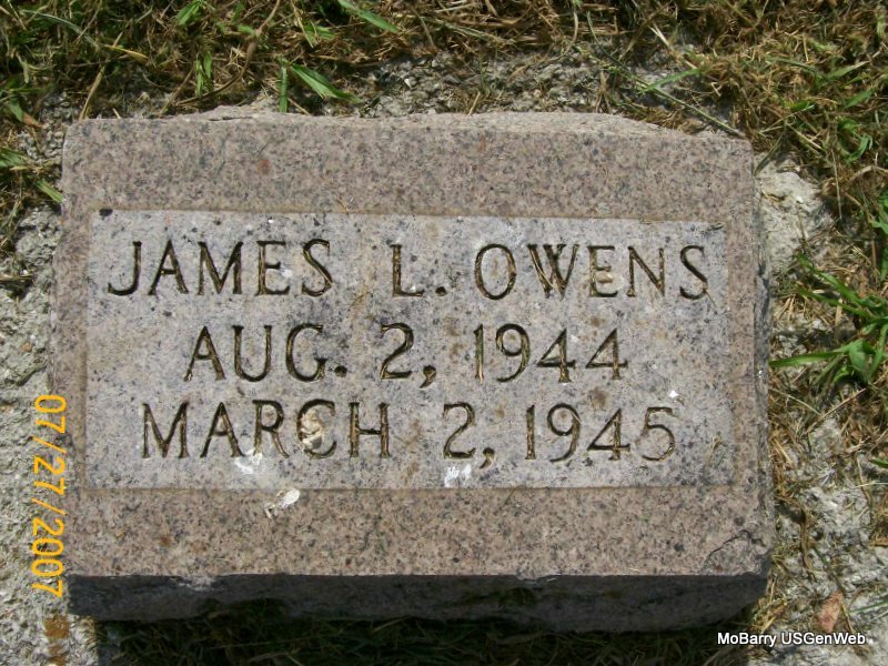 Research Note: Son of James Arthur and Goldie. He was buried in the J. A. and Goldie Owens cemetery plot. Phyllis' Note: According to his death certificate he was age 7 months old when he died. He was a son of James Owen born Butterfield, MO and Goldie Tinker born Joplin, MO. Cause of death, pneumonia. - Another Photo | Headstone Keith Owens Death Certificate Phyllis Long Photo Jay Trace |