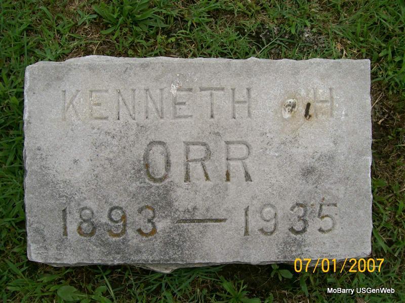 Research Note: His death certificate gives his birth date as Mar. 20, 1891 and not 1893 as the stone reads. He was a salesmen. He died from the effects of general paralysis of the insane and dehydration. His father was named Robert Orr, born in Millersburg, KY and his mother was Minnie Bell Kennedy, born in TN. Mrs. Robert Orr, Monett, MO, gave the information. | Death Certificate Donna Cooper Photo Jay Trace |