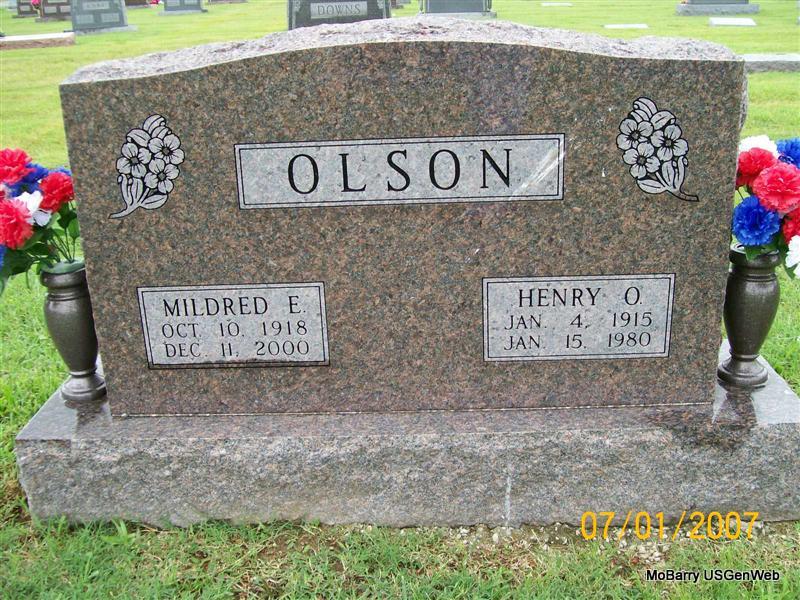 SSW: Henry O. - Research Note: Daughter of Ira Osman and Blanche (Marshall) Garris, married Henry Oscar Olson on August 15, 1940, in Monett, and he preceded her in death January 15, 1980. She was a lifelong area resident and owned and operated Olson Freight Company with her husband until retiring in 1979. She was preceded in death by one daughter, Barbara Ball, on November 14, 1996; three sisters, Irene Mourglia, Lucille Evans, and Mary Brittle; and one brother, Carl Garris. She is buried next to her parents. | Monett Times Dec. 12, 2000 Mary Homesley Photo Jay Trace |