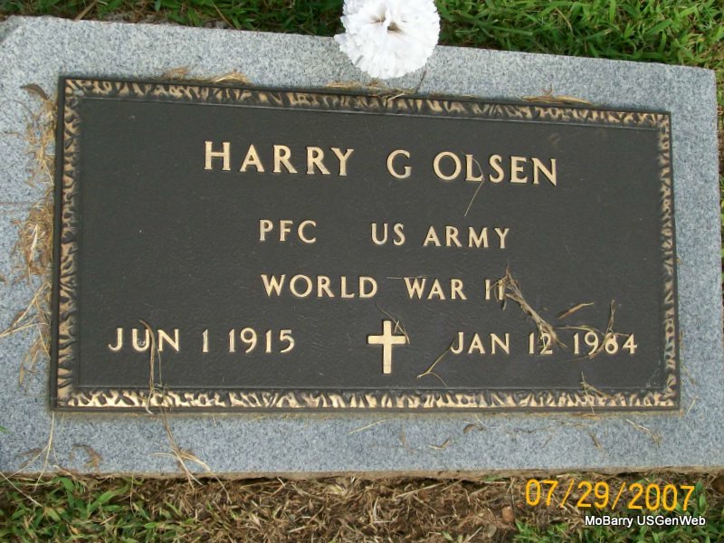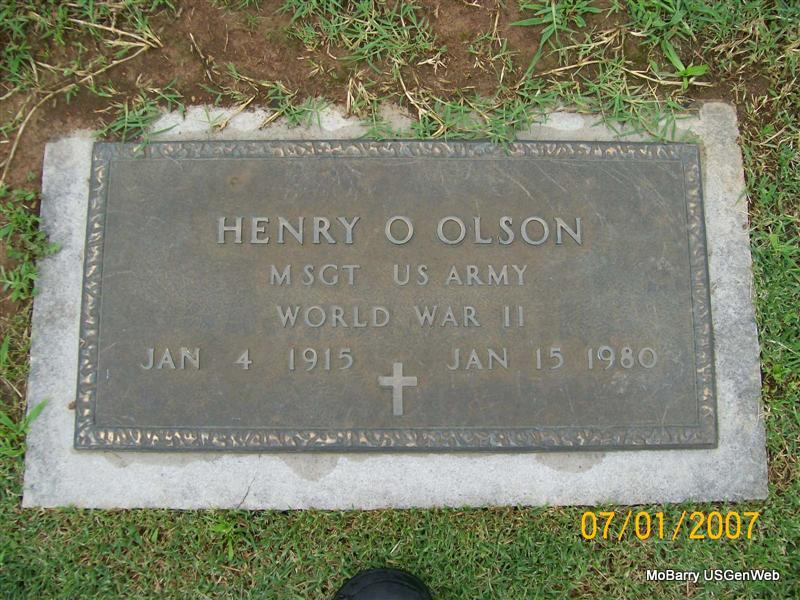 | OLSON, Henry Oscar | Jan. 4, 1915 | Jan. 15, 1980 | SSW: Mildred E. - Research Note: Son of Edward Nelson and Bettie E. Nord. - Military Stone - Inscription: "MSGT US ARMY WORLD WAR II" | Census Phyllis Long Photos Jay Trace |