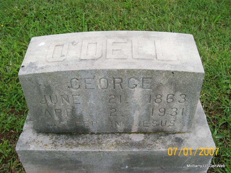 Apr. 2, 1931 | Research Note: He has a matching stone to Mahala Ann Bartley and is buried next to her. Callaway Funeral Home Records state that he was born in Sneedville, TN, in 1862 and not 1863 as the stone reads and that he died Apr. 2, 1931 from the effects of influenza. He was age 68 years, 9 months and 11 days old. Jerry O'Dell was given as his father and Martha Ray as his mother, both born in TN. Place of death is not given. His wife was Mary Jessie. - 1910 Census, Monett Ward 3, Barry, Missouri - William O'Dell, head, age 45, married 19 years, born TN, parents born TN, brakeman for the railroad; Jessie, wife, age 37, married 19 years, mother of 1 child, living, born MO, father born TN, mother IN; Edward, son, age 15, born MO. - 1920 census, Monett Ward 3, Barry, Missouri - George, age 52, born TN and Jessie, age 48, born MO, living with son Edward and first wife Rose Belle. - George W., age 67, born TN and Jessie, age 54, born MO, are still living with son Edward and second wife Mamie E. Edward's occupation was moving picture operator. - 1940 Census, Springfield, Greene, Missouri - George has died. Mary J., age 68, widowed, born MO, is living with son Edward and second wife Mammie E. Edward's occupation was motion picture operator. - Edward, Mamie, and Jessie are all buried at Sunny Lane Cemetery, Del City, OK. | Callaway Funeral Home Donna Cooper Census Phyllis Long Photo Jay Trace |