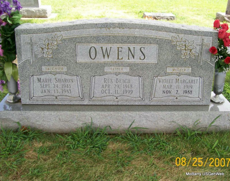 SSW: Marie Sharon and Violet Margaret - Inscription: "Father" - Research Note: He was the son of John Albert and Susie Independence (Russell) Owens. He was a retired United States Department of Agriculture inspector, a member of the First Baptist Church and Chapter 190 Order of the Eastern Star in Monett, and an Air Force veteran of World War II. He married Violet Schmersey on January 22, 1941, and she preceded him in death November 2, 1988. He was preceded in death by one daughter, Marie Owens, on January 13, 1983. Son of John A. Owens born Calhoun, Miller Co., MO and Susan Independence Russell born Wetumpka, Indian Territory, OK. His wife was Violet Margaret Schmersey. This person is not listed on the IOOF cemetery log. | Note Donna Cooper Bennett-Wormington Funeral Home Birth Certificate MO Marriage Records Phyllis Long Photo Jay Trace |