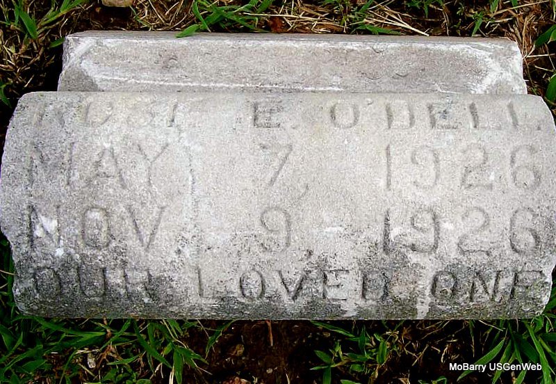 Inscription: "Our Loved One" - Research Note: The death certificate is for Rose Elizabeth O'Dell, who died at age 6 months and 1 day. It states that she was born May 8, 1926 and not the 7th as the stone reads. Her father is given as Edward O'Dell, born Monett, MO and her mother as Mayme E. (Mayme Elizabeth Widener) Evans, born TX. The cause of death was given as influenza. Edward O'Dell, Monett, MO, was the informant. Callaway Funeral Home recorded that she was born May 8, 1926 in Monett, MO. Granddaughter of George William O'Dell. | Death Certificate Callaway Funeral Home Donna Cooper Photo Jay Trace |