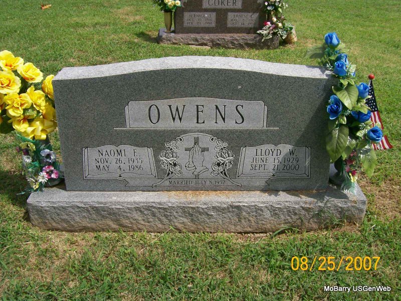 SSW: Naomi E. - Inscription: "Married July 8, 1952" - Research Note: Son of James Arthur and Goldie Ann (Tinker) Owens. He was a retired carpenter, and moved back to Monett from Bonner Springs in 1989, then moved to El Dorado Springs three years ago. He married Naomi Lawson in 1952, and she preceded him in death in 1986. He married Tina Sue Dunkin on April 30, 1988, in Bonner Springs, Kansas. He was buried in the Loyd Owens cemetery plot. | Monett Times Sept. 22, 2000 Mary Homesley Photo Jay Trace |