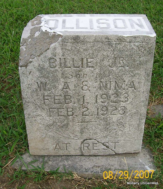 | OLLISON, Billie, Jr. | Feb. 1, 1923 | Feb. 2, 1923 | Inscription: "Son of W. A. and Nima" | Photo Jay Trace |