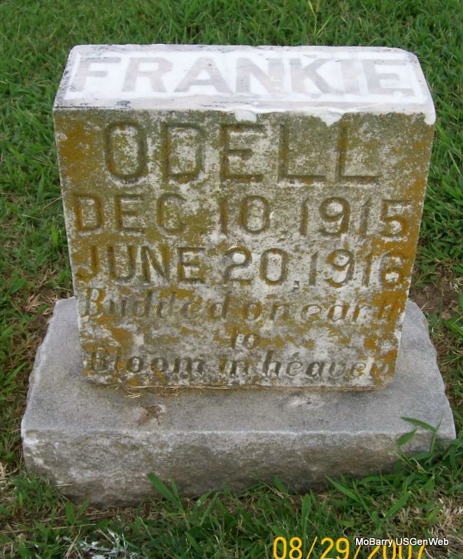 Research Note: His death certificate reads that his name was Frank O'Dell and that he was age 6 months and 10 days old when he died and the cause of death was double pneumonia and complicated by cerebral-spinal meningitis, simple. His father was Ed O'Dell, born Monett, and his mother was Bell Phialon, born AR. He was buried in IOOF on June 21, 1916. Ed O'Dell, Monett, MO, was the informant. Phyllis' Note: His death certificate reads that he was age 6 months and 10 days old when he died. He was a son of Ed O'Dell born Monett, Barry Co., MO and Bell Phialon born AR. The cause of death was double pneumonia. | Death Certificate Donna Cooper Death Certificate Phyllis Long Photo Jay Trace |