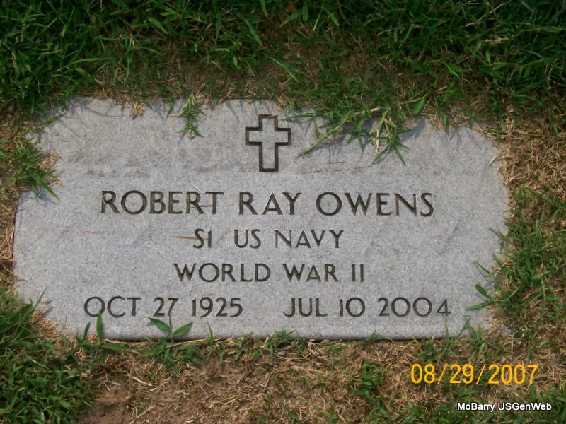 SSW: Enid Louise - Inscription: "Married Oct. 26, 1947" - Research Note: Robert Ray Owens, age 78, of Monett, died July 10, 2004, at Cox Medical Center in Springfield, MO. He was born October 27, 1925, in Monett, MO., and was a son of James Arthur "Boots" and Goldie Ann (Tinker) Owens. On October 25, 1947, he was married to Enid Louise Amos who preceded him in death on May 26, 1960. He later married Blanche Ivy, then Ruth Irene Keeton. He attended school in Monett, MO. He was a truck driver for many years and was a machinist for Roderick Arms in Monett until retiring. He lived most of his life in the Monett area, moving to the Missouri Veteran's Home in Mt. Vernon, MO when his health declined. He served in the U. S. Navy during World War II. He was preceded in death by three brothers, Paul Edward, Lloyd Wayne and James Leon Owens; grandsons Chad Keith Owens and Christopher Alan Tiffin. - Military Stone - Inscription: "S1 US NAVY WORLD WAR II" | Monett Times, July 12, 2004 Donna Cooper Photos Jay Trace |