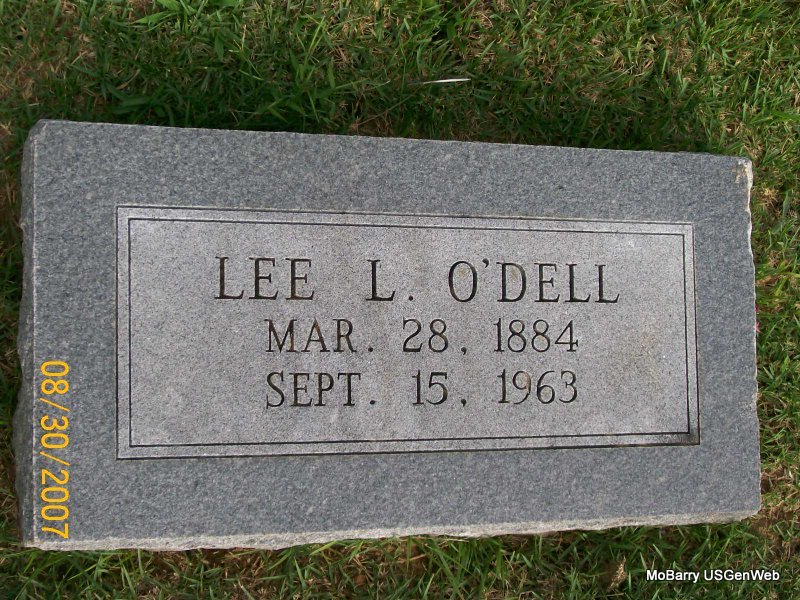 Research Note: Son of Sidney O'Dell and Dora Jessie Turner. His wife Was Anna and she was the informant on the death certificate. He was a retired Frisco passenger conductor. Lee L. O'Dell was buried in IOOF on Sept. 16, 1963 and Anna E. O'Dell purchased the lot according to the cemetery log book. - 1940 Census, Monett Ward 2, Barry, Missouri - Lee O'Dell, lodger, age 26, single, born NC, father born GA, mother KY, brakeman for the railroad. Living with Eugene and Nellie O'Brien. | IOOF Log Book Donna Cooper Census Death Certificate Phyllis Long Photo Jay Trace |