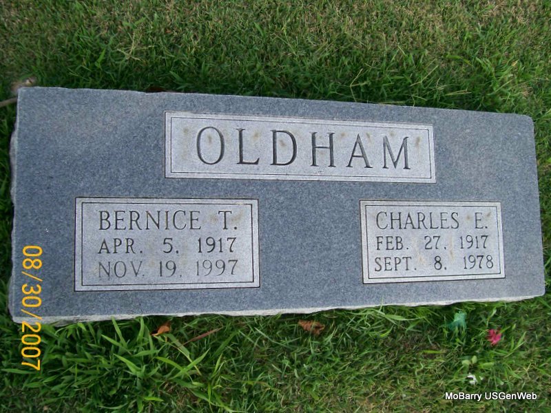 | OLDHAM, Bernice T. (THOMAS) | Apr. 5, 1917 | Nov. 19, 1997 | SSW: Charles E. - Research Note: Charles Elvin Oldham, age 24, married Bernice Thomas, age 24, on Sept. 5, 1941 in Aurora, Lawrence Co., MO. Both were from Cape Girardeau, MO. Daughter of Raymond John Thomas, Jr. and Anita Anna Laura Allers. | MO Marriage Records Census Phyllis Long Photo Jay Trace |