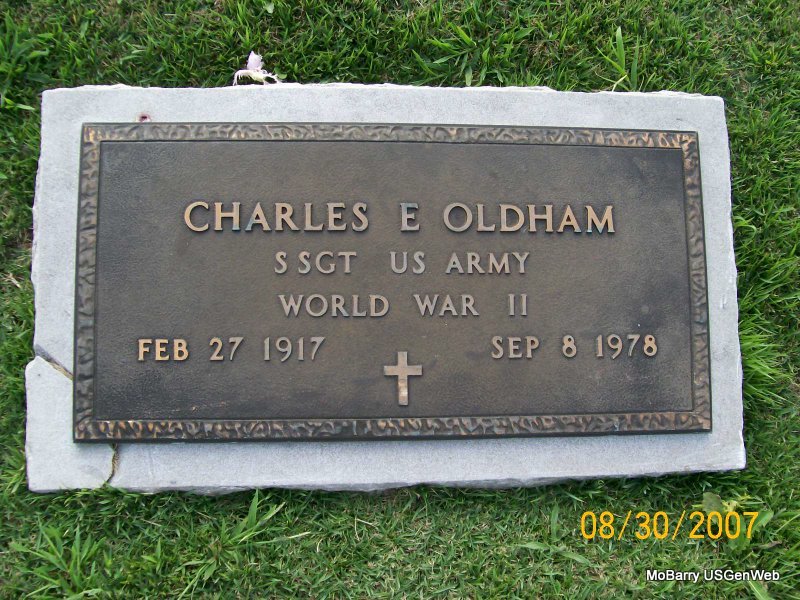 | OLDHAM, Charles Elvin | Feb. 27, 1917 | Sept. 8, 1978 | SSW: Bernice T. - Research Note: Son of Emory Lloyd Oldham and Alpha Bloodworth. - Military Stone - Inscription: "S SGT US ARMY WORLD WAR II" | Census Phyllis Long Photo Jay Trace |