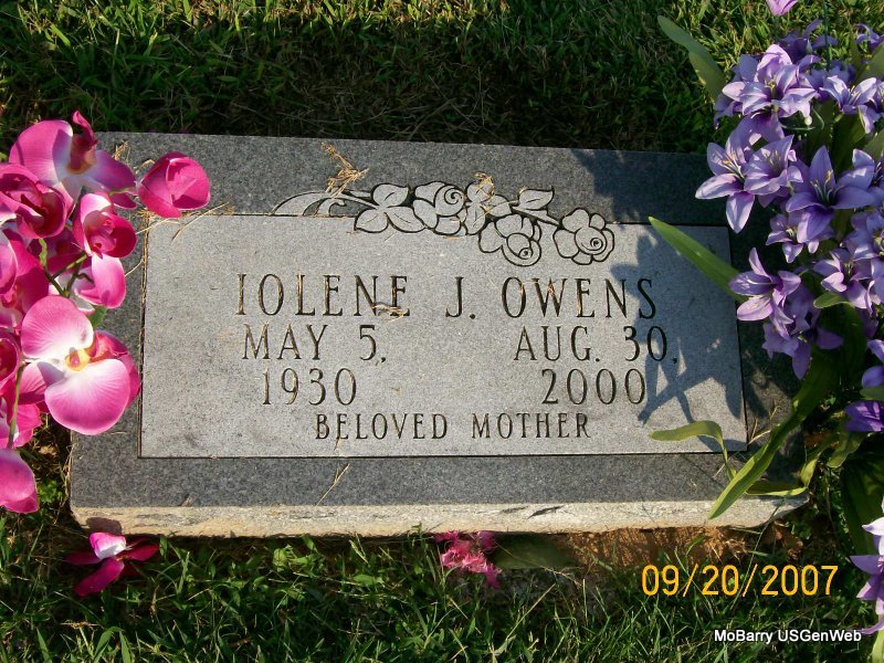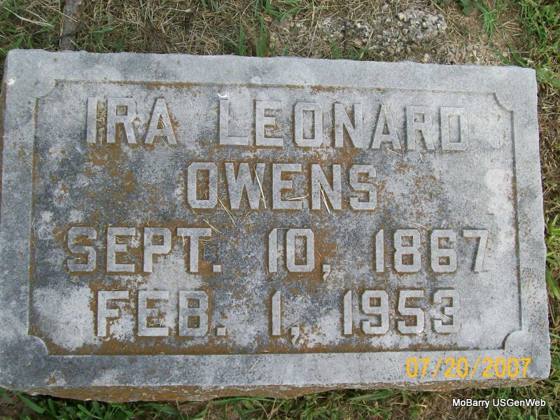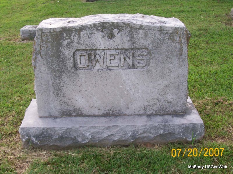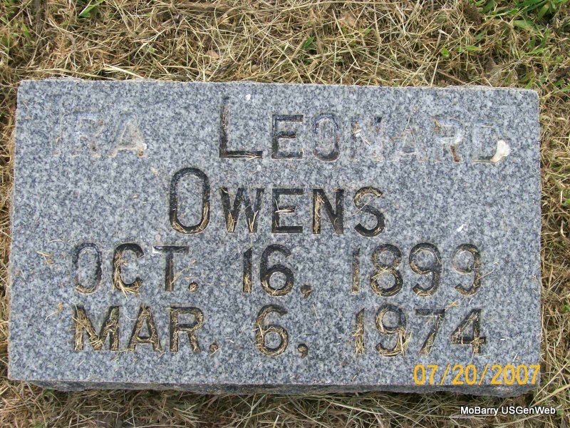 Research Note: His residence was listed as Monett, MO, on his death certificate. His parents were Ira Benjamin and Ruth (Layton) Owens. His wife was given as Mable Bare Davis. He was a sewing machine dealer and was widowed at the time of his death. Ira Leonard Owens, Jr. gave the information. - Owens Plot Stone - Owens Plot Stone - Another Photo | Death Certificate Photos Donna Cooper Photos Jay Trace |
