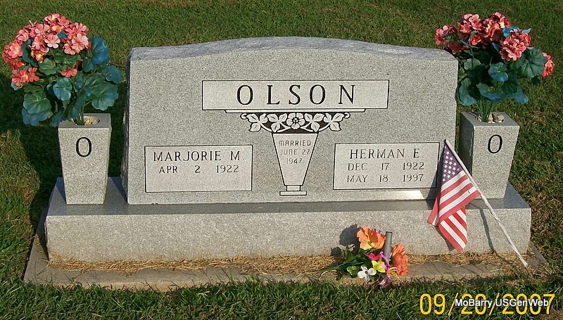 SSW: Herman E. - Inscription: "Married June 27, 1947" - Research Note: She was the daughter of Thomas P. and Mabel (Jones) Mooney. She was a nurse for Dr. Frank Kerr for 25 years and director of nursing at Lacoba Homes in Monett until her retirement. She married Herman E. Olson on June 27, 1947, in Monett, Mo., and he preceded her in death on May 18, 1997. She was preceded in death by one brother, George Mooney; one sister, Angeline Manes; and one nephew, Tim Mooney. | Buchanan Funeral Home Phyllis Long Photo Jay Trace |