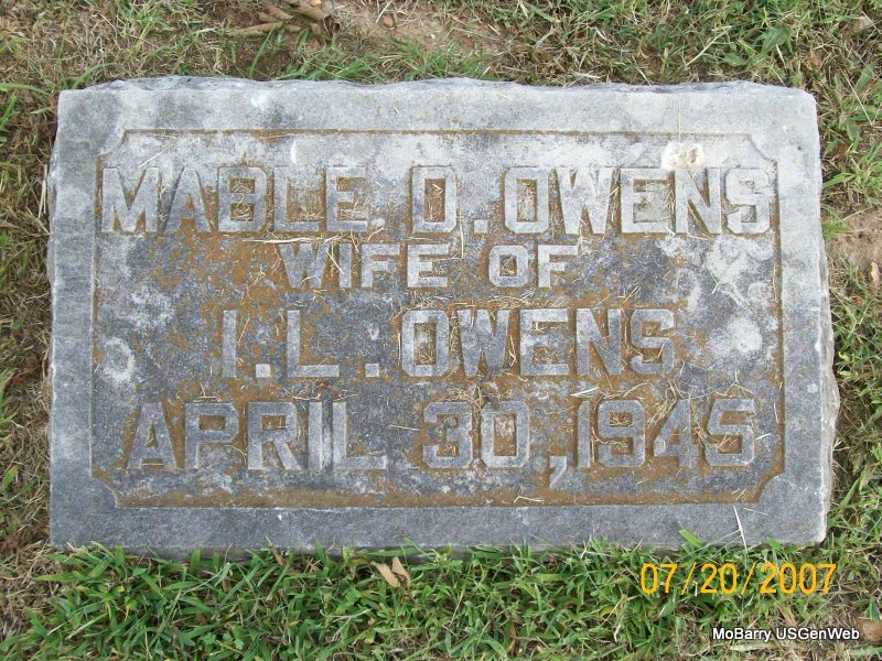 Inscription: "Wife of I. L." - Research Note: According to the cemetery log book, she was buried in the J. L. Owens cemetery plot. - Her stone has Mabel spelled Mable. Phyllis' Note: According to her death certificate she was age 67 years, 10 months and 28 days old at the time of her death. She was married, husband was Ira Leonard Owens, age 77. She was a daughter of W. Scott Davis born OH and Mary Ann Moon born MI. Cause of death, apoplexy. Ira Owens was the informant. - Owens Plot Stone - Owens Plot Stone - Another Photo | Photos Note Donna Cooper Death Certificate Phyllis Long Photos Jay Trace |
