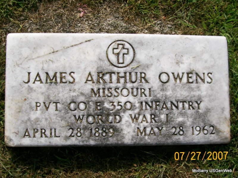 SSW: Goldie - Research Note: He was a retired carpenter. Son of W. E. Owens and Artelia Moudy. Goldie Tinker was his wife and she was the informant on the death certificate. - Military Stone - Another Photo - Military Stone - Inscription: "JAMES ARTHUR OWENS, MISSOURI PVT. CO 3 350 INFANTRY - WORLD WAR I" | Death Certificate Phyllis Long Photos Keith Owens Photos Jay Trace |