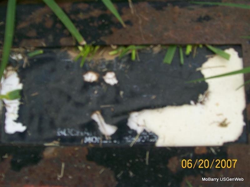 Research Note: A single "Express Man," died of pulmonary tuberculosis. His father is listed as W. P. (William Preston) Rhoderick of Dent Co., MO, residing in Monett, MO and his mother is listed as Mary Bougher of Phelps Co., MO. Family members in IOOF spelled last name as "Roderick," but father signed death certificate " Rhoderick." Donna's Note: He is not listed in the cemetery log book under Rhoderick but under Roderick. He is listed in Callaway Funeral Home records as George E. His wife was Mary Elizabeth Bougher/Boyer. Roderick, and as buried in IOOF. The information is the same in Callaway as in the death certificate. POSSIBLY NO STONE - Log states: "Can't Read Stone" | Death Certificate Jay Trace Note IOOF Log Book Donna Cooper |