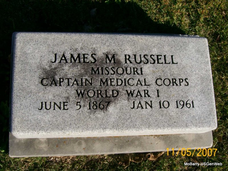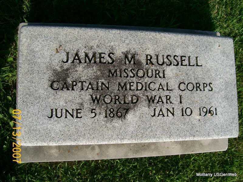 Inscription: "MISSOURI CAPTAIN MEDICAL CORPS - WORLD WAR I" - Research Note: He is buried next to Alma E. (Norris) Russell his wife. Son of Bingley Russell and Elizabeth McKenzie. - Military Stone | Death Certificate Phyllis Long Photos Jay Trace |