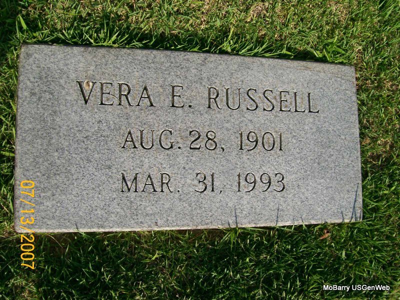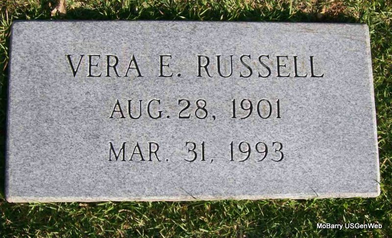 | RUSSELL, Vera Elvira (SEATON) | Aug. 28, 1901 | Mar. 31, 1993 | Research Note: She is buried next to Paul B. Russell. Daughter of Louanna Garrison and James E. Seaton. Vera E. Seaton, age 18, married Paul B. Russell, age 23, on Jan. 8, 1920 in Jackson Co., MO. - Another Photo | MO Marriage Records Census Phyllis Long Photos Jay Trace |