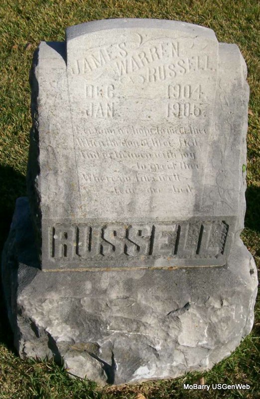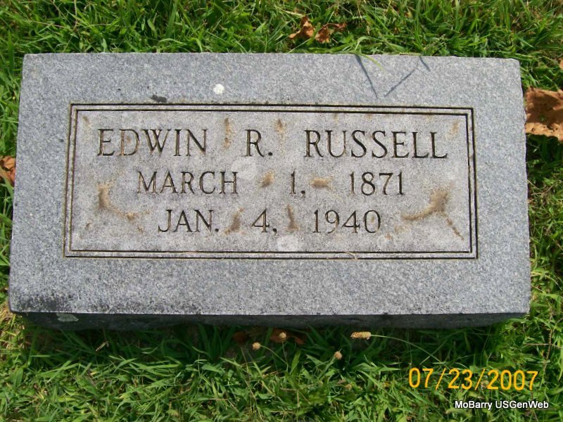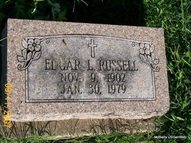 | RUSSELL, Edgar L. | Nov. 9, 1902 | Jan. 30, 1979 | Research Note: He is buried next to Ann Russell. - Possible marriage record: Edgar L. Russell married Lucy Ann Cox on Mar. 3, 1909 in Hopkins, Nodaway Co., MO. | MO Marriage Records Phyllis Long Photo Jay Trace |