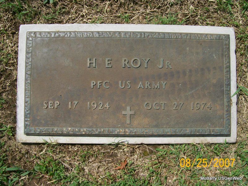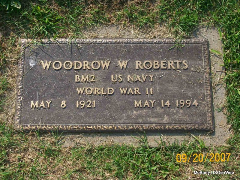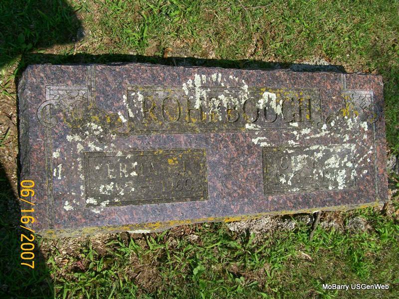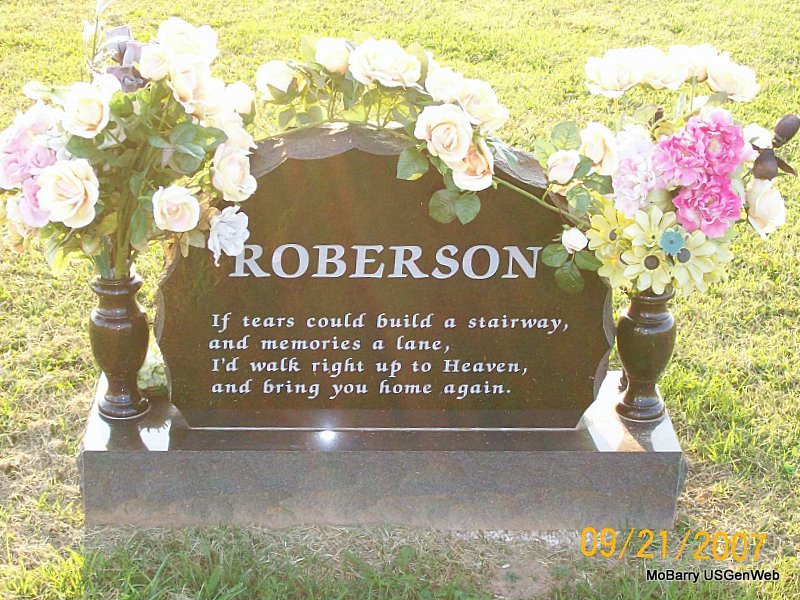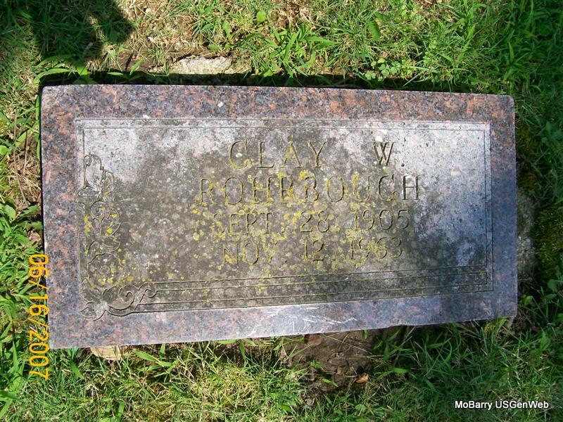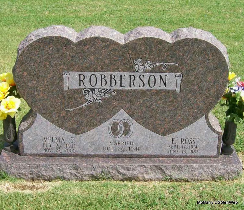 | ROBBERSON, E. Ross | Sept. 17, 1914 | June 13, 1987 | SSW: Velma P. - Inscription: "Married Oct. 26, 1941" - Research Note: Son of Arthur Elmon Robberson and Mary Artie Wormington. | Census Phyllis Long Photo Jay Trace |