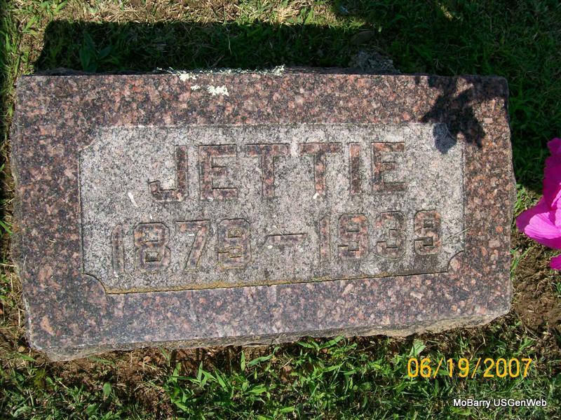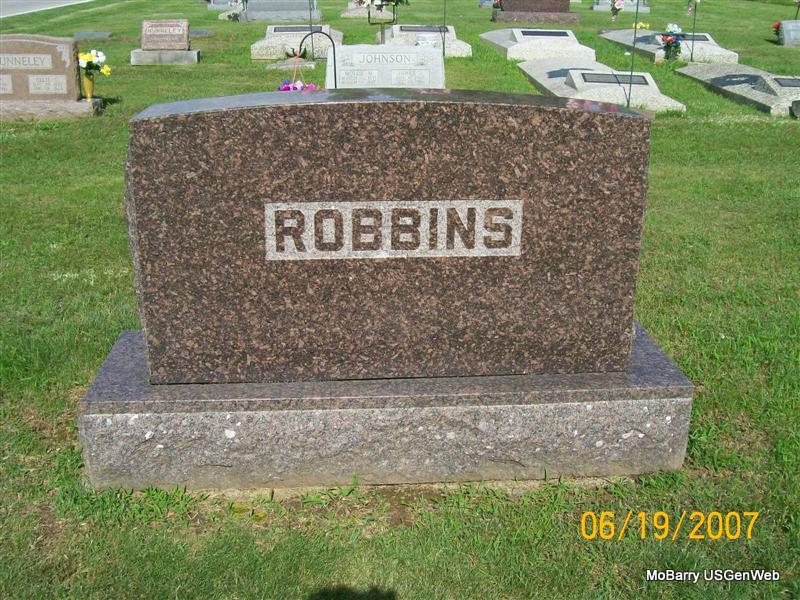 SSW: Jettie - Research Note: He was a son of Loring Clark and Samantha (Goodnight) Robbins. Bert Robbins, age 21, first married Louella Harper, age 24, on Aug. 5, 1903 in Pioneer, Barry Co., MO. He second married Jettie (Morris) Heath, and third, Lena Oldham. - Robbins Plot Stone | Note Donna Cooper MO Marriage Records Census Phyllis Long Photos Jay Trace |