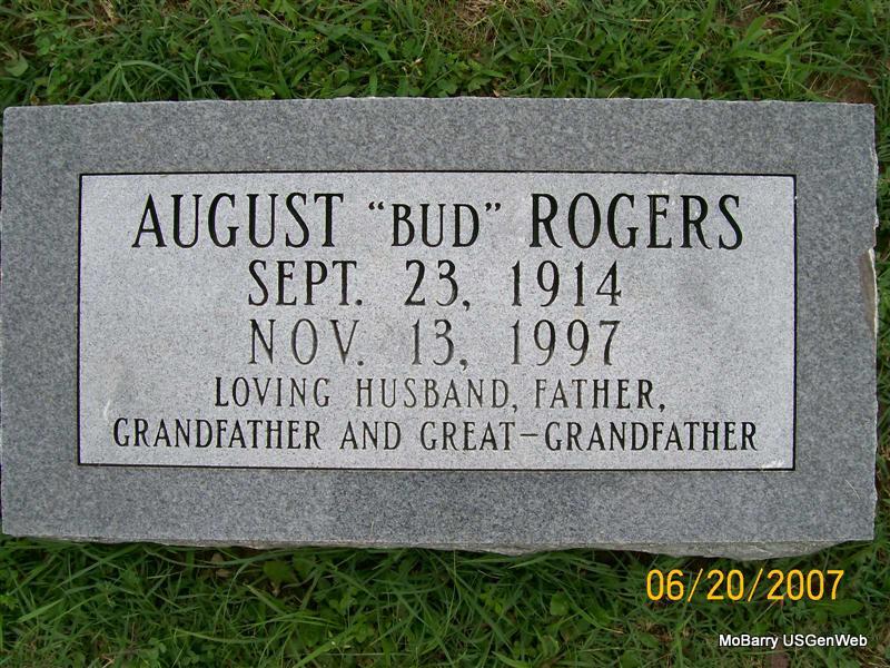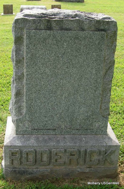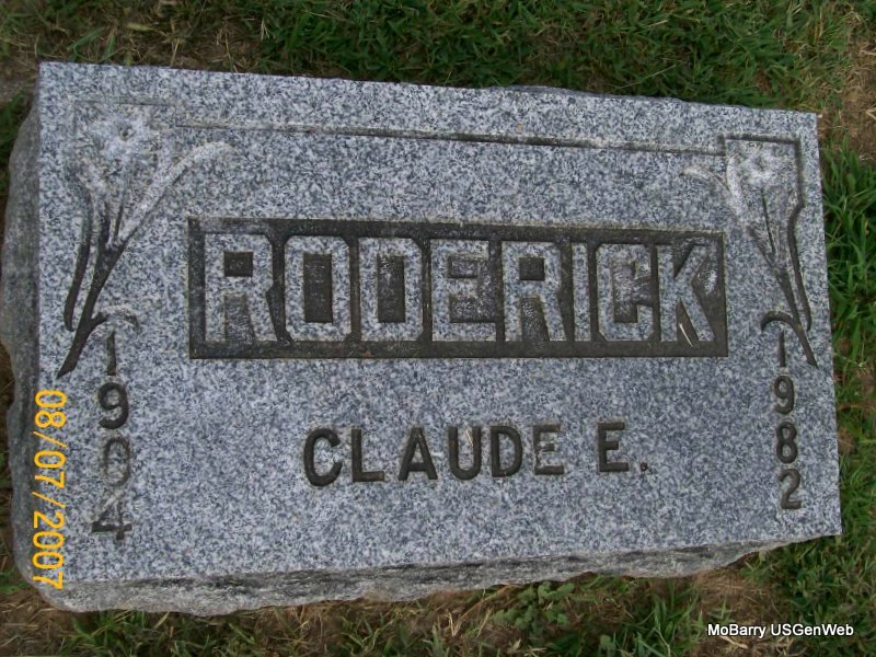 | RODERICK, Claude Everett | 1904 | 1982 | Research Note: Son of Adolphus Albert Roderick and Sarah Anna Hudgens. His wife was Ethel Virginia Amber. - King - Roderick Plot Stone | Census MO Marriage Records Phyllis Long Photos Jay Trace |