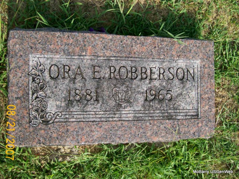 Research Note: Son of Thomas H. Robberson and Malinda Waltrip. He was retired from the Frisco RR. Lyle Jefferson of Monett, MO was the informant on the death certificate. Thomas is buried at Goodnight Cemetery and Malinda is buried at Eugene Gates Cemetery aka Elijah Waltrip Family Cemetery. - Thomas H. Robberson first married Malinda Waltrip on June 4, 1874 in Barry Co., MO, died in 1893 and is buried in Eugene Gates Cemetery. - Ora E. and brother William E. Robberson are in Miami, Dade Co., FL in the 1930 census, both single. | Census Father's Obit Death Certificate Phyllis Long Photo Jay Trace |
