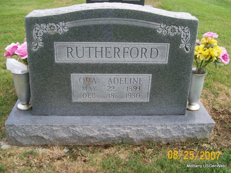 | RUTHERFORD, Ova Adeline (HARRELL) (METCALF) | May 22, 1899 | Dec. 18, 1980 | Research Note: She first married Elijah J. Metcalf and second Jesse Harrison Rutherford. - Jesse Harry Rutherford, age 85, married Ova Adeline (Harrell) Metcalf (widow of Elijah Metcalf), age 84, on Mar. 1, 1976 in Lawrence Co., MO. | MO Marriage Records Census Phyllis Long Photo Jay Trace |