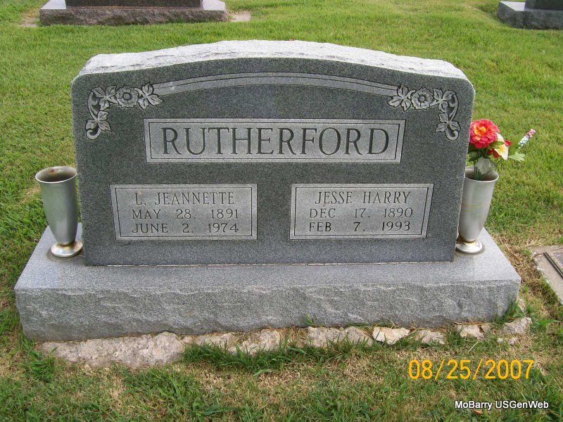 Feb. 7, 1993 | SSW: L. Jeannette - Research Note: Son of Jesse Alexander Rutherford and Mary Ellen Stowell. J. H. Rutherford married Bessie Scott on Sept. 8, 1920 in Lawrence Co., MO. J. H. Rutherford, age 55, married Jeannette Boucher, age 55, on July 11, 1946 in Lawrence Co., MO. Jesse Harry Rutherford, age 85, married Ova Adeline (Harrell) Metcalf (widow of Elijah Metcalf), age 84, on Mar. 1, 1976 in Lawrence Co., MO. - Military Stone - Inscription: "PFC US ARMY WORLD WAR I" | Census MO Marriage Records Phyllis Long Photos Jay Trace |