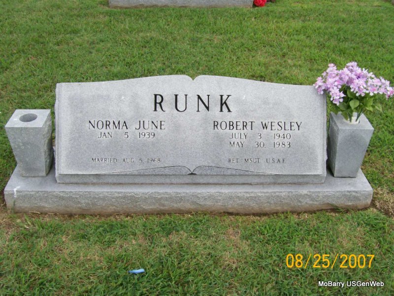 | RUNK, Robert Wesley | July 3, 1940 | May 30, 1983 | SSW: Norma June - Inscription: "RET MSGT U. S. A. F." - "Married Aug. 5, 1968" | Photo Jay Trace |