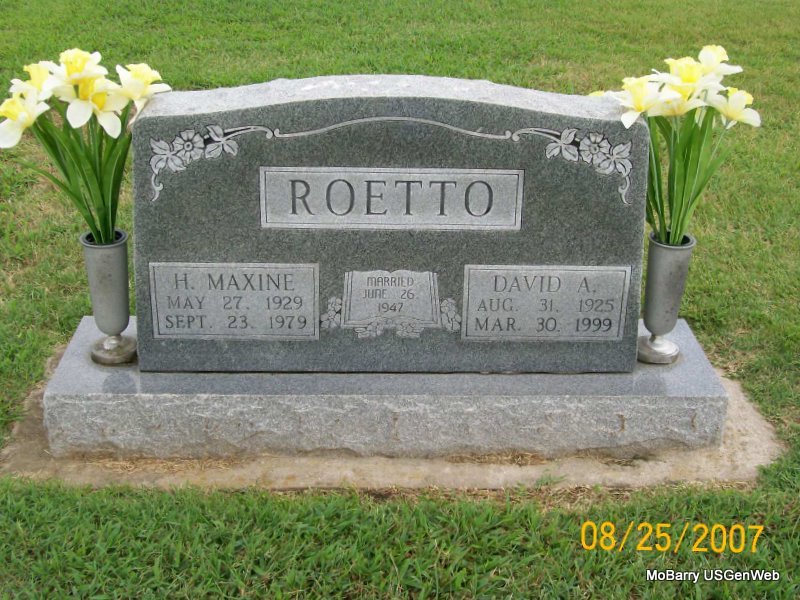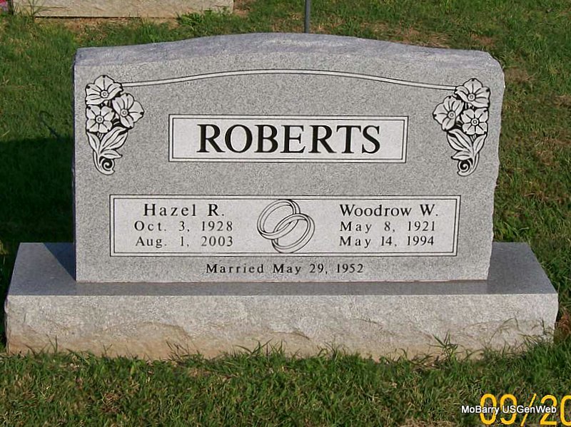 SSW: Woodrow W. - Inscription: "Married May 29, 1952" - Research Note: Hazel Roberta Roberts, age 74, of Springfield, formerly of Monett, died August 1, 2003, at James River Care Center in Springfield. She was born October 3, 1928, in Clarendon, TX, and was a daughter of Alford and Lucy (Tucker) Langford. She was a retired nurse and a member of the Church of Christ in Monett. She married Woody W. Roberts on May 17, 1952, in Levelland, Texas, and he preceded her in death. She is not listed in the cemetery log book. | Obit IOOF Log Book Donna Cooper Photo Jay Trace |