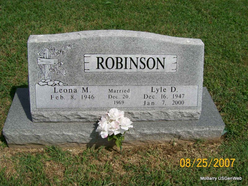 SSW: Leona M. - Inscription: "Married Dec. 20, 1969" Research Note: Son of Merl and Tressa (Cummins) Robinson. He moved to Monett 25 years ago and was a retired city employee. He married Leona Mills on December 20, 1969. | Monett Times Jan 10, 2000 Mary Homesley Photo Jay Trace |