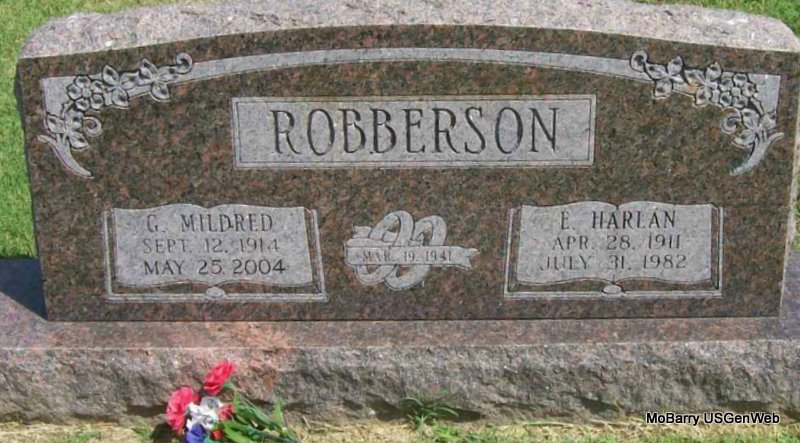 | ROBBERSON, E. Harlan | Apr. 28, 1911 | July 31, 1982 | SSW: G. Mildred - Inscription: "Married Mar. 19, 1941" - Research Note: Son of Arthur Elmon Robberson and Mary Artie Wormington. | Census Phyllis Long Photo Jay Trace |
