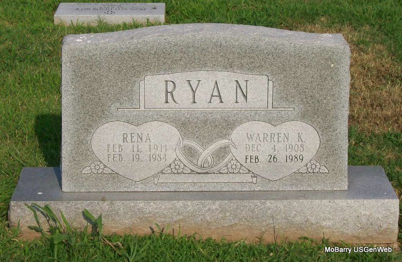 | RYAN, Warren K. | Dec. 4, 1908 | Feb. 26, 1989 | SSW: Rena - Research Note: Maybe the son of Warren K. Ryan, Sr. and Myrtle Mauzry. First wife Mary. | Census Phyllis Long Photo Jay Trace |
