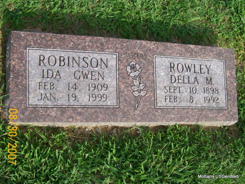 | ROBINSON, Ida | Feb. 14, 1909 | Jan. 19, 1999 | SSW: Della M. Rowley - Inscription: "Sisters" - Research Note: The funeral home was Walnut Lawn in Springfield, MO, according to the log book. | IOOF Log Book Phyllis Long Photo Jay Trace |