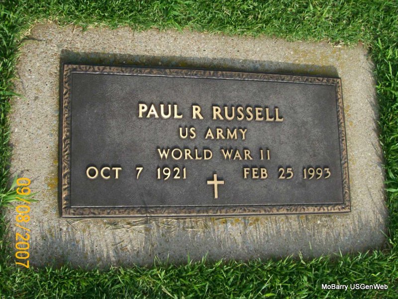 | RUSSELL, Paul R. | Oct. 7, 1921 | Feb. 25, 1993 | SSW: Dorothy L. - Inscription: "Married May 25, 1942" - Research Note: According to the cemetery log book he was cremated. Son of Charles Russell and Bertha Teel, buried at New Site cemetery. 1930 and 1940 census says Charles was divorced. His children were living with him. - Military Stone - Inscription: "US ARMY WORLD WAR II" | IOOF Log Book Census Phyllis Long Photo Jay Trace |